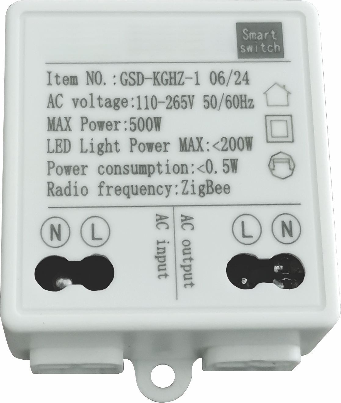 Name : Relay On/Off Switch Working Voltage : AC90-265V 50/60Hz Protocol : ZigBee Size : 64*32*63mm Max Power : <500 W Led Light Power : <200 W Power Consumption : <0.5 W Function : Smart life APP system controls the connecting device as a switch